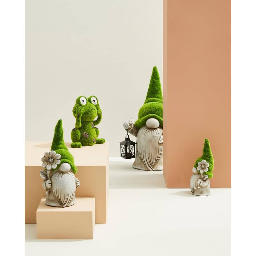 Statua gnomo garden realizzato in magnesio, con cappello effetto erba, Completa di lanterna nella quale è possibile inserire una candela.