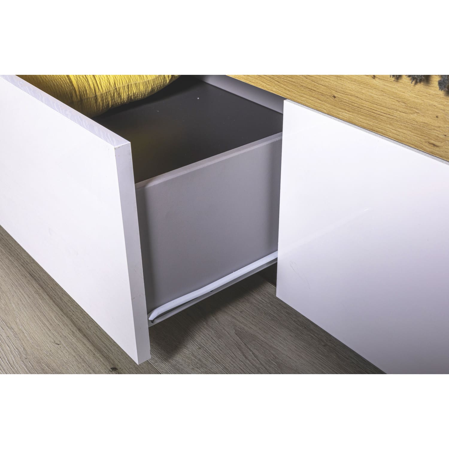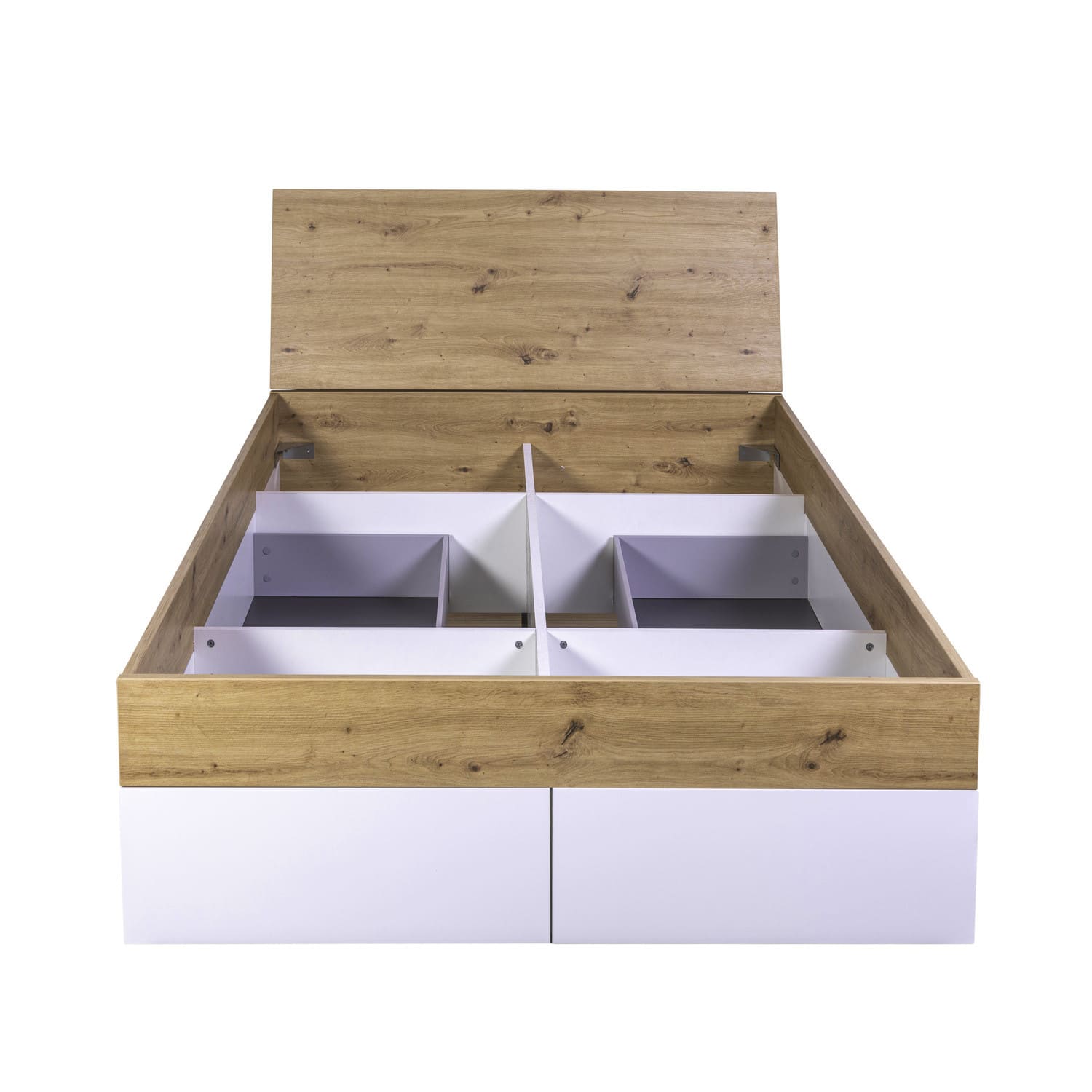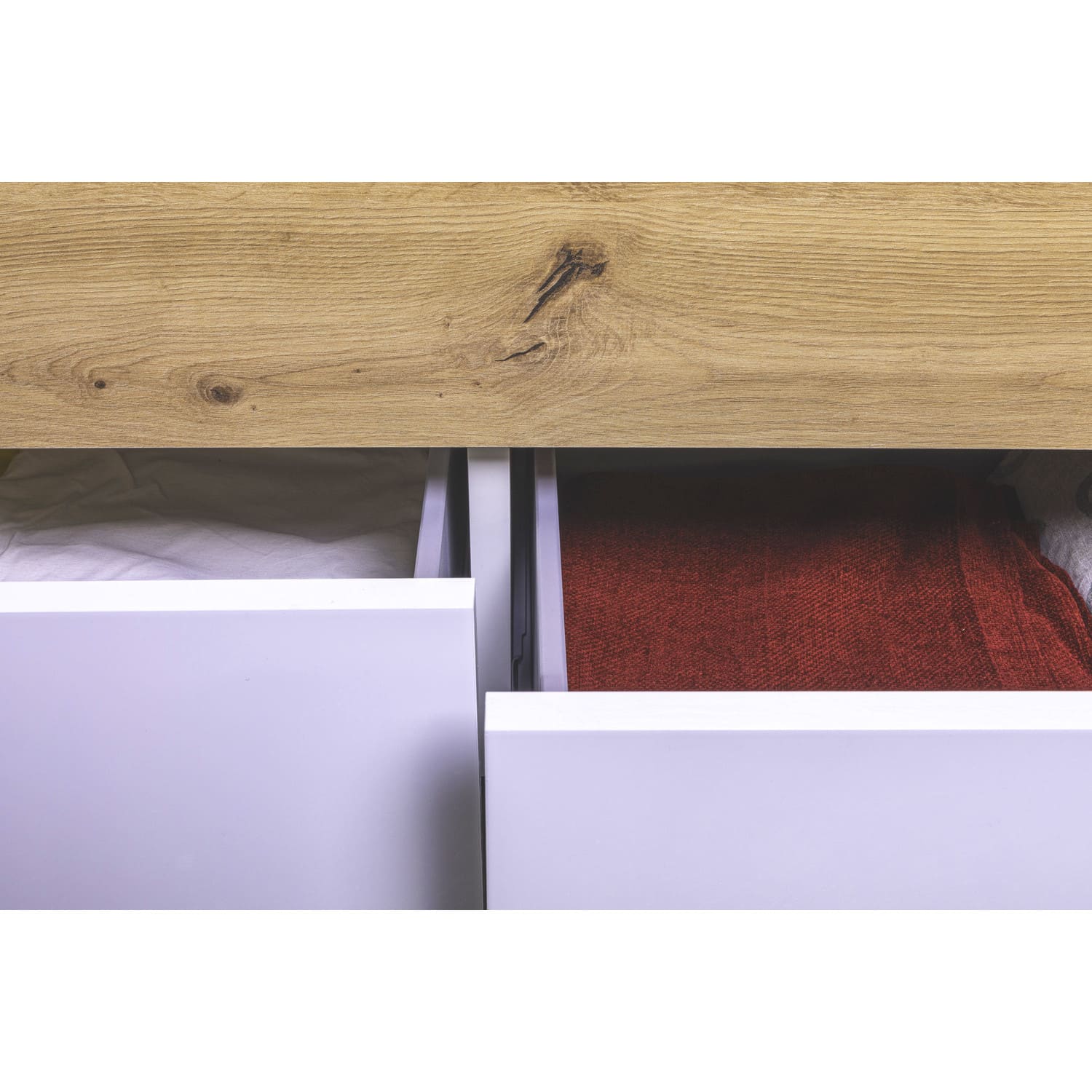 Letto Globo 1 piazza e mezza con 4 cassetti contenitori, porta naturalezza e modernità in camera da letto. Attraverso l’essenza del rovere come richiamo alla natura e il bianco laccato lucido per illuminare gli ambienti, tutta la linea Globo è pensata e disegnata per infondere agli ambienti freschezza e luce. Il design giovanile di questo letto a una piazza e mezza con cassettone contenitore lo rende perfetto per ambienti kids bedroom o per la camera degli ospiti. Struttura realizzata con Pannello Ecologico® nobilitato da 22 mm di spessore con rivestimento melaminico rovere naturale. Testata superiore realizzata con Pannello Ecologico® nobilitato da 22 mm di spessore con rivestimento melaminico bianco con verniciatura laccata lucida. Cassetto contenitore realizzato con Pannello Ecologico® nobilitato da 16 mm di spessore con rivestimento melaminico bianco con verniciatura laccata lucida con maniglia in plastica trasparente con anima bianca. E’ presente un divisorio sotto al piano del materasso e che unisce la testiera alla pediera; questo per agevolare le operazioni di pulizia e per conferire ancora più robustezza e portanza all’intera struttura.