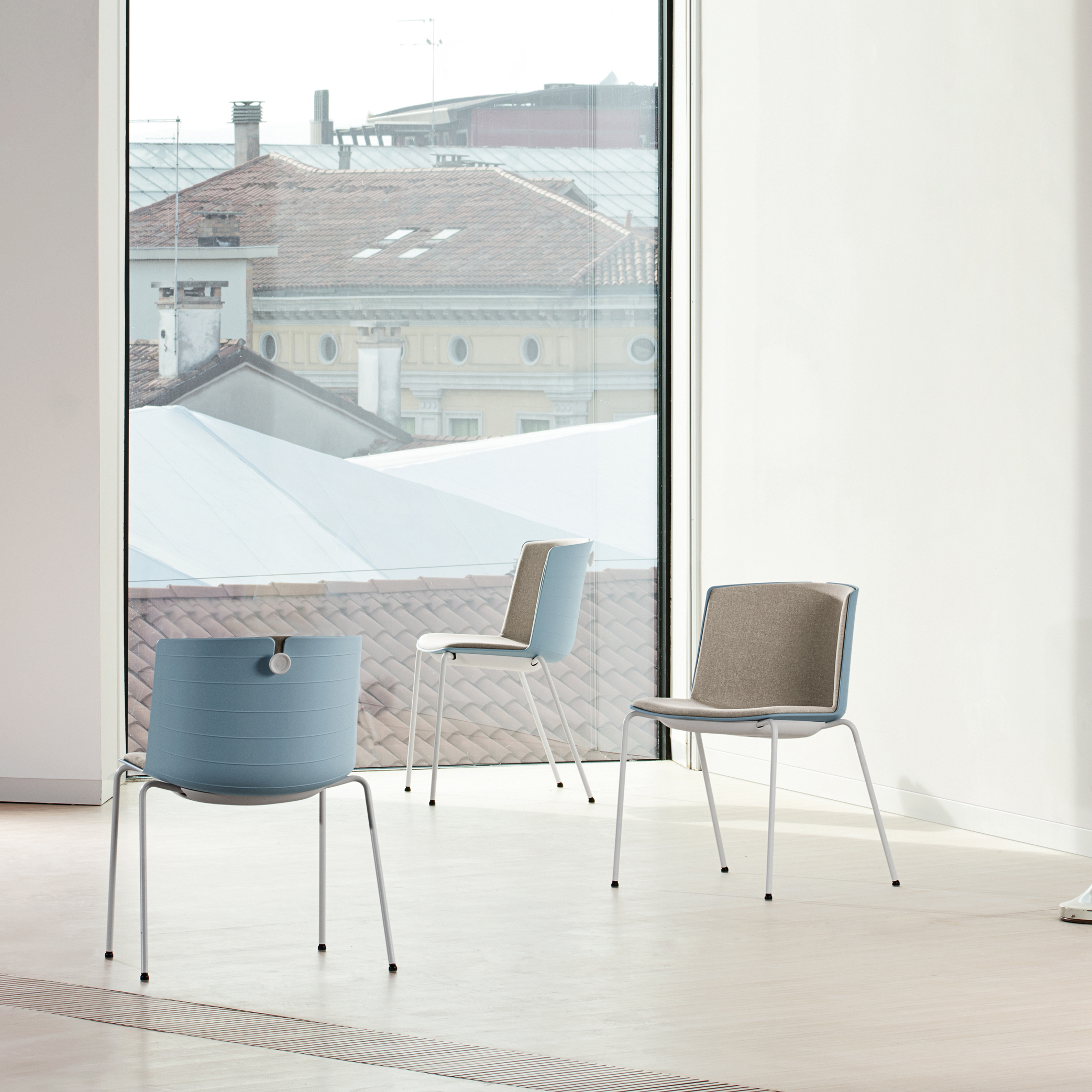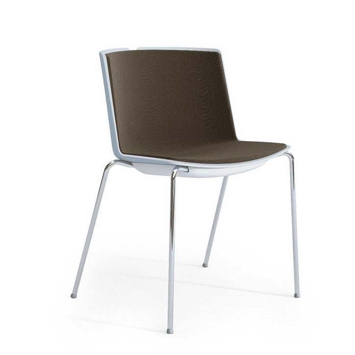 La sedia Clark ha sedile e schienale imbottiti in resina espansa ignifuga, scocca in plastica PXC, un bottone colorato sullo schienale ed è impilabile fino a 4 pezzi. La base è a 4 gambe in metallo con piedini snodabili e sottosedile colorato